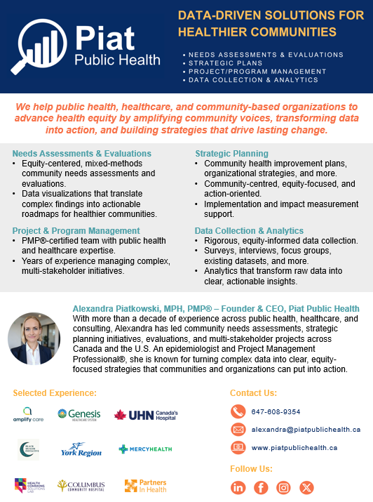 We conduct comprehensive community needs assessments and evaluations. Taking an equity-centred approach, we use mixed-methods research and engage with communities to gain insight into public health priorities. Each report includes high-quality data visualizations, tailored to translate complex data sets into accessible, actionable roadmaps to improved community health.